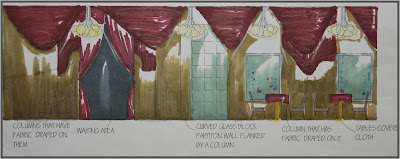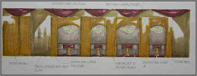 The floor plan of the store showing the seating arrangements as well as the planter and aquarium placement. Two interior Perspectives that show the copper booths, as well as the copper planters in more detail. The elevations show the aquairum in the walls as well the fabric draped down the columns and walls, and again the copper booths.